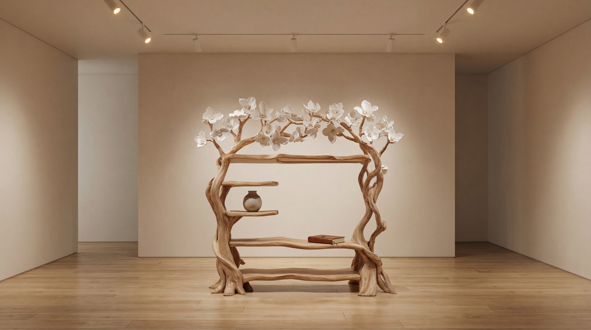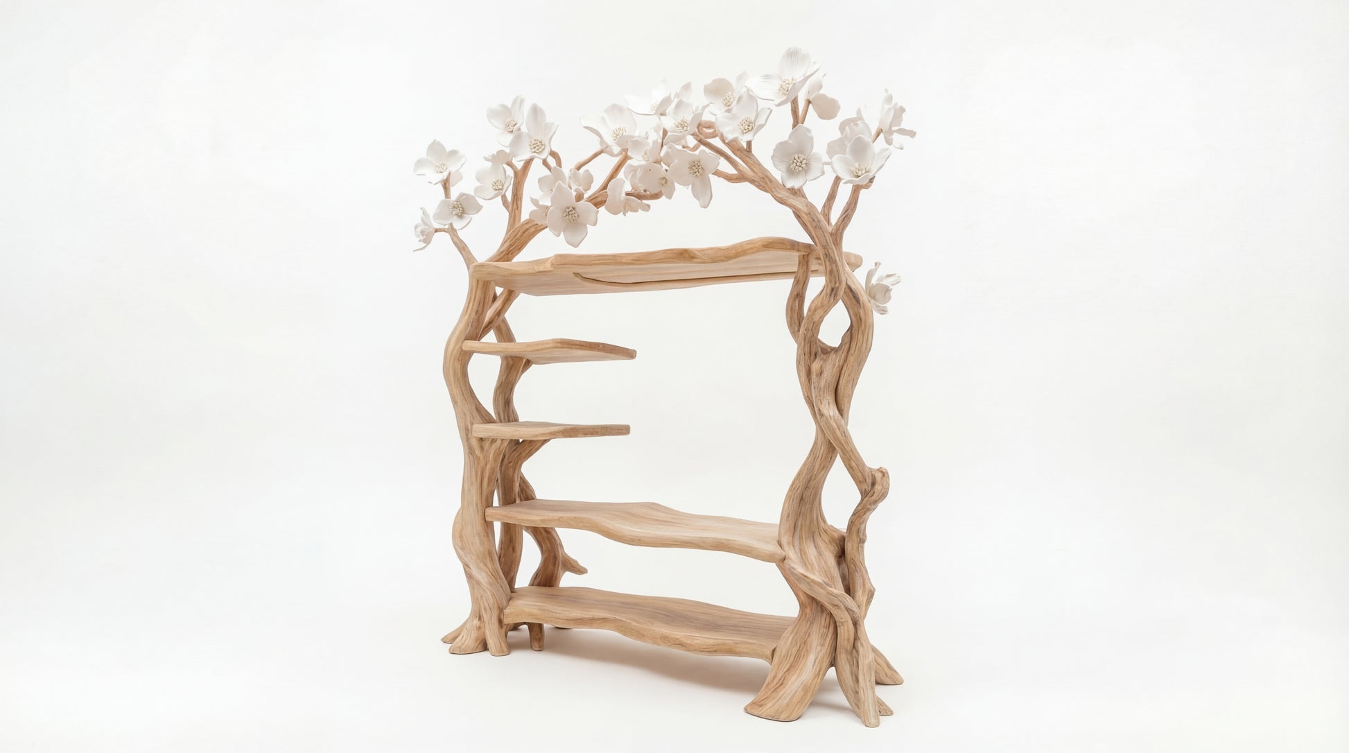 Above, hand-sculpted white blossoms spread gently across the branches, creating a soft, serene crown. The contrast between the warm wood grain and the delicate floral elements gives the piece a dreamlike presence — peaceful, airy, and refined.