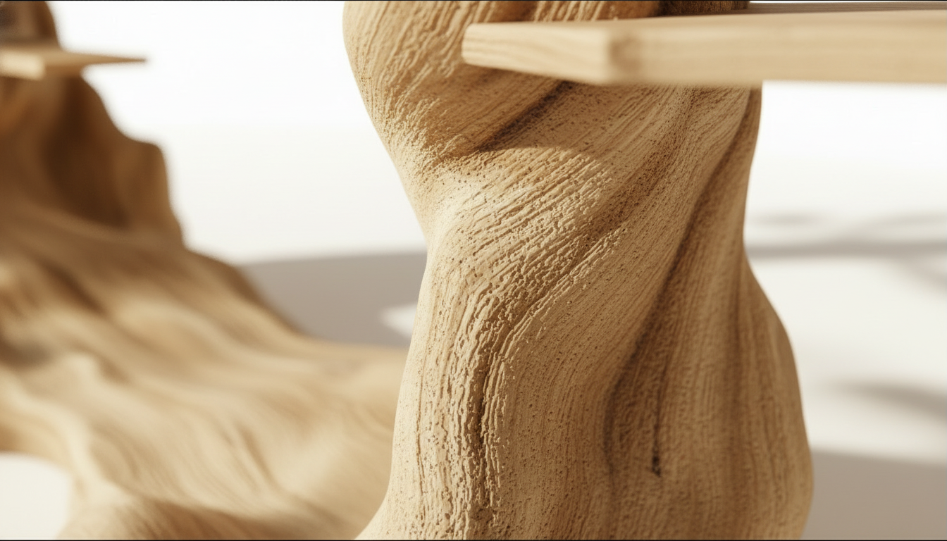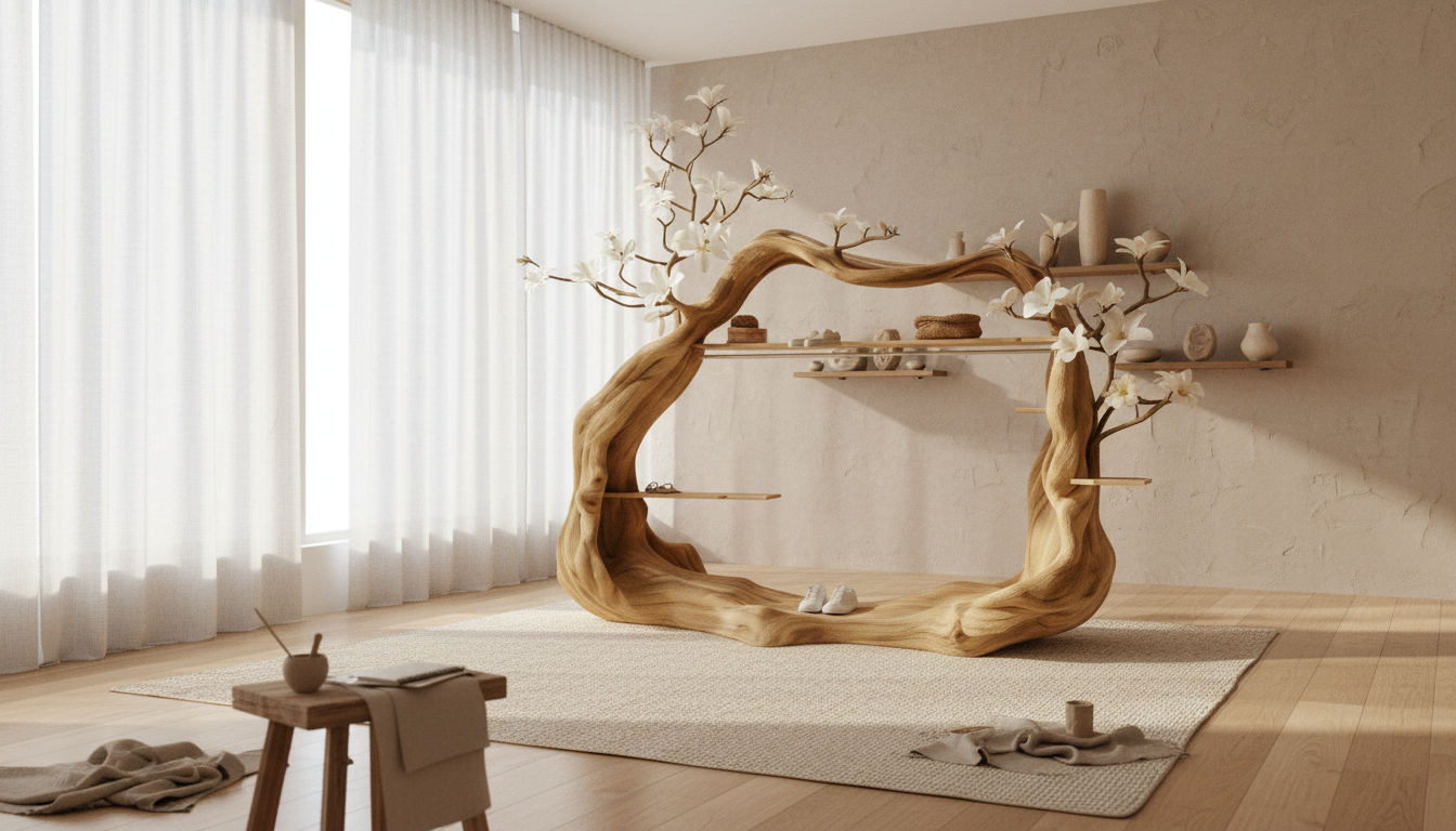 Inspired by flowering tree canopies, this design symbolizes growth, balance, and harmony. The curved wooden trunk forms an organic arch, while branch-like extensions and shelves appear to grow naturally from the structure.