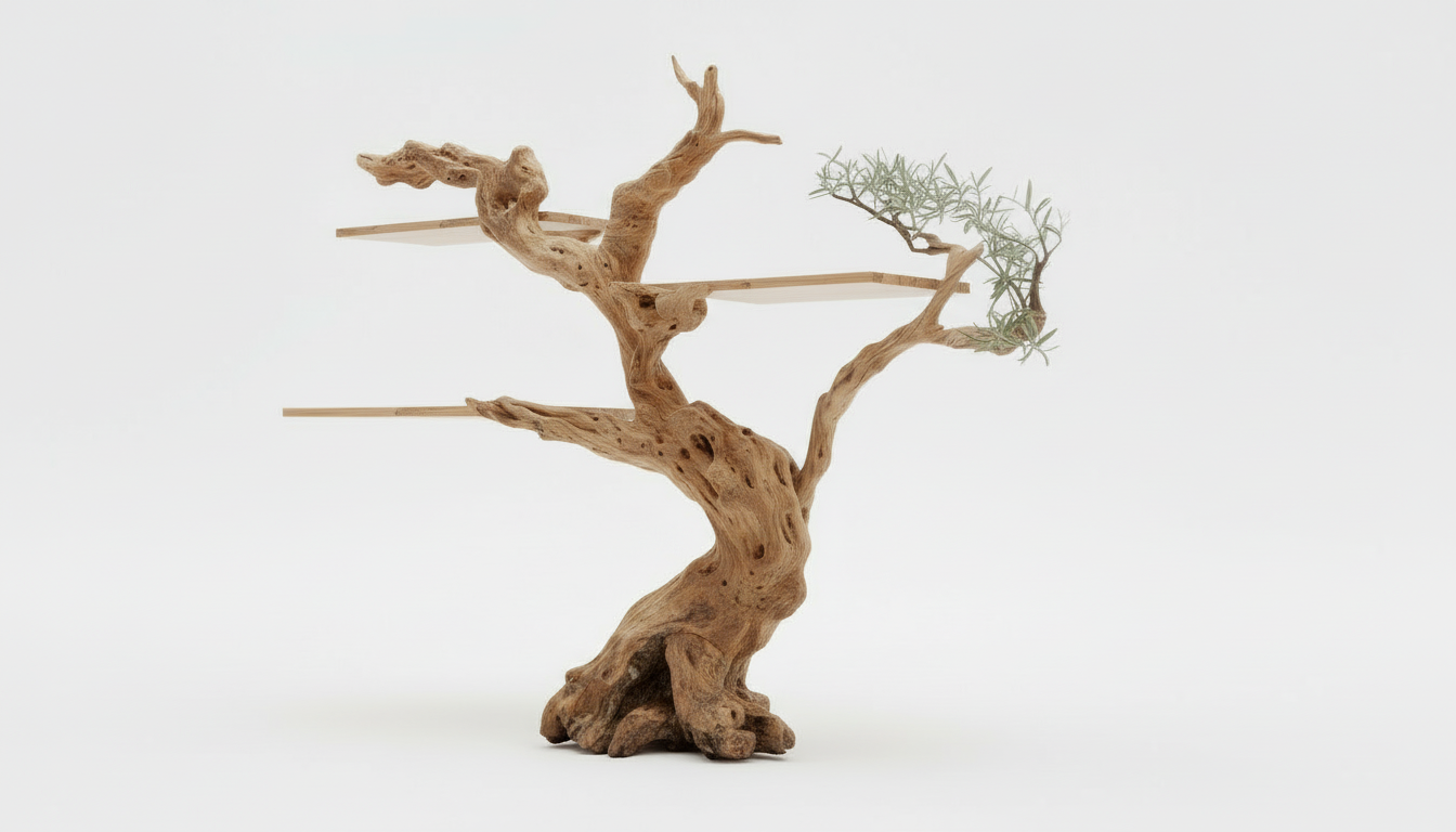 Arborline is inspired by ancient driftwood trees, bonsai forms, and the quiet asymmetry of nature. The trunk twists organically, while horizontal shelves extend like branches—never rigid, never forced.