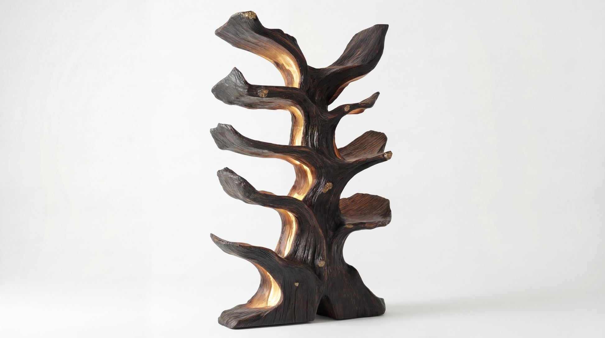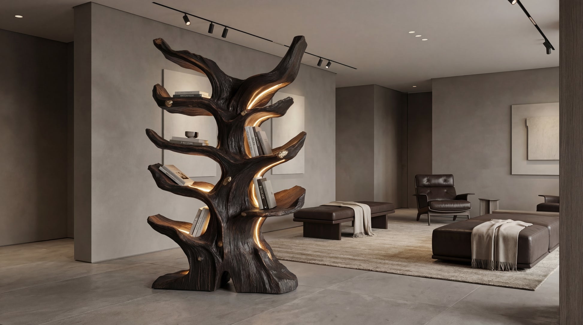 Emberwood Tree Bookshelf – Sculpted Light, Living Form