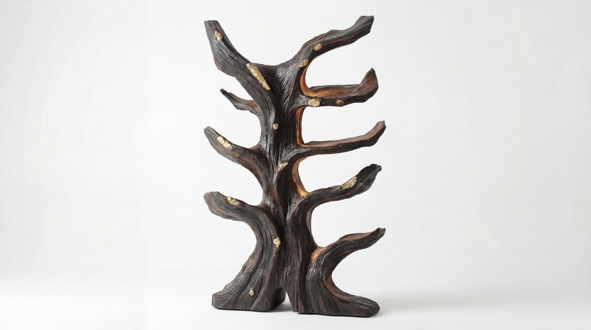 Inspired by ancient trees shaped by time and fire, Emberwood celebrates contrast: dark against light, strength against warmth, stillness against flow. The trunk rises organically, branching into carved alcoves that function as shelves. Integrated lighting washes the inner grain with a gentle glow, creating a museum-like presentation for books and objects.